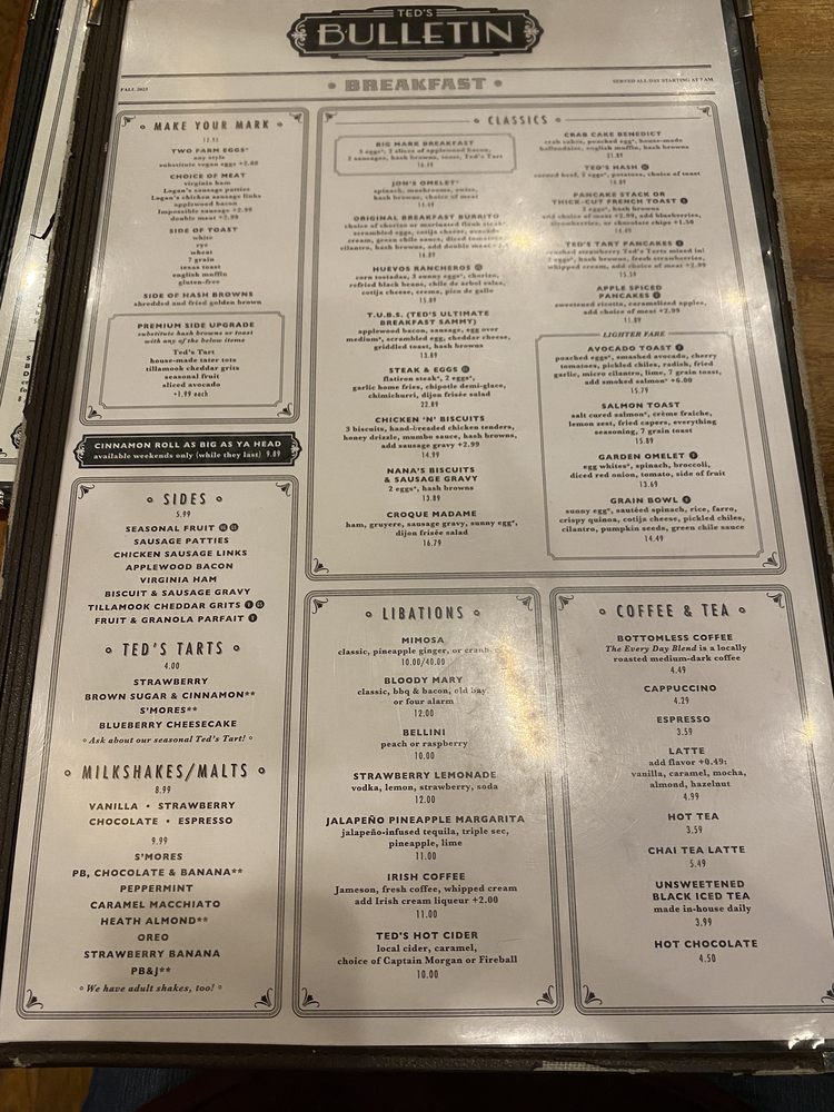 Welcome to Ted's Bulletin, the heart of comfort food in Reston, VA. Nestled at 11948 Market St, this vibrant eatery offers a delightful blend of New American cuisine, specializing in breakfast, brunch, lunch, and dinner. With an extensive menu, you can start your day with fluffy pancakes or hearty biscuits and gravy, or wind down with a delectable seasonal cheesecake or their renowned Ted's Tarts.